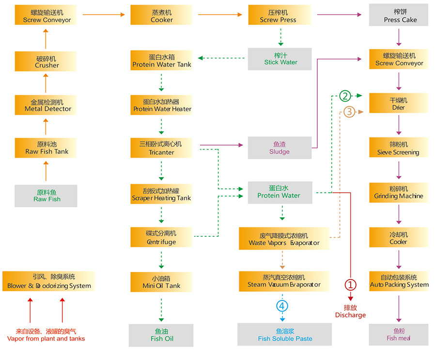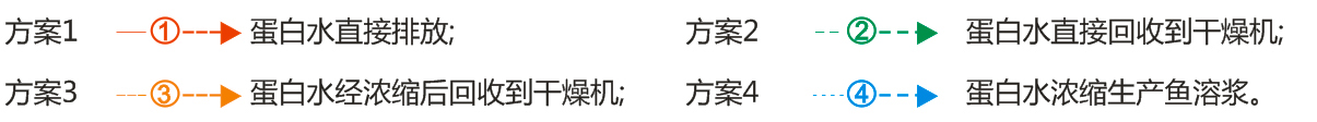 濕法魚粉魚油生產(chǎn)系統(tǒng)對(duì)榨汁進(jìn)行固雜、油水分離后,獲得蛋白水。根據(jù)對(duì)分離機(jī)出來的蛋白水所采取的不同加工工 藝,可以提供4種不同的魚粉生產(chǎn)線配套方案。