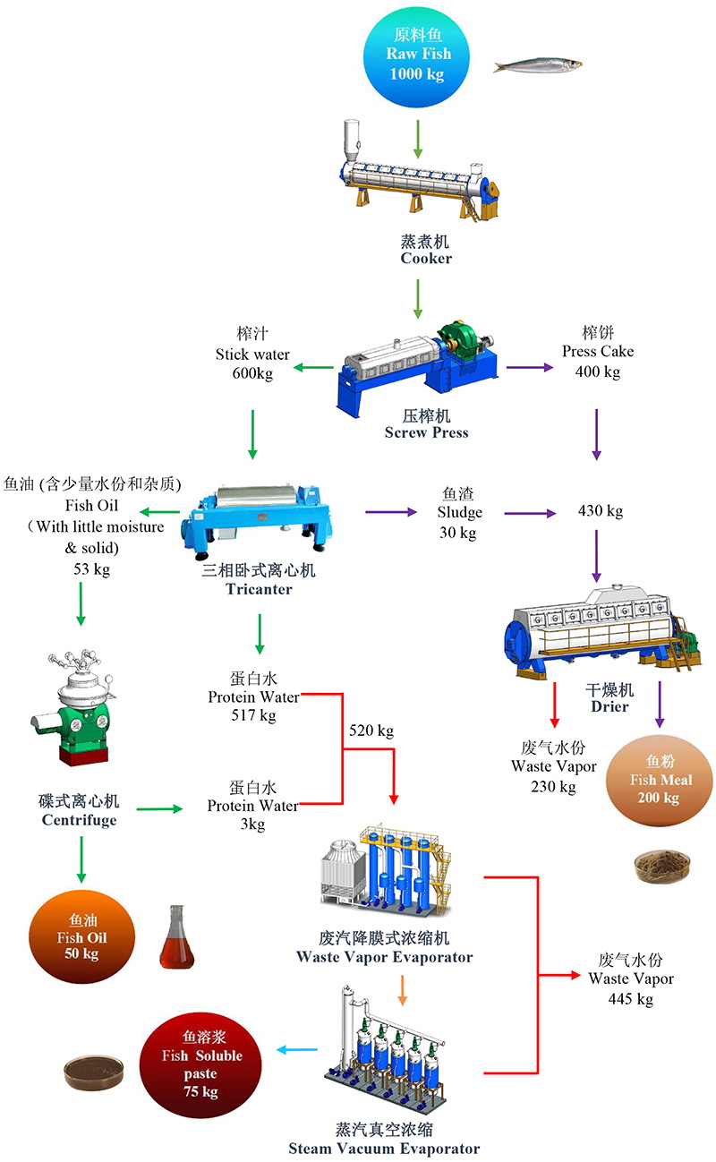 我們可以根據(jù)客戶的投資規(guī)模,工廠選址,環(huán)保要求等條件,為其選擇更好的工藝方案?,F(xiàn)以第4種生產(chǎn)線配套方案為例作簡要介紹,同時結(jié)合相應的工藝流程圖及物料平衡圖,供客戶參考。物料平衡圖中的數(shù)據(jù),尤其是魚油的得率,會因原料魚種類及其捕獲季節(jié)的不同而有所變化。